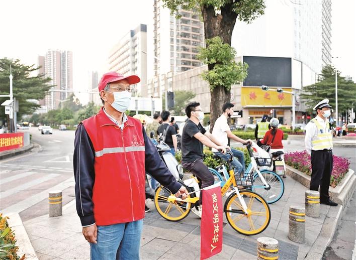 义工在民治街头开展交通文明劝导。
