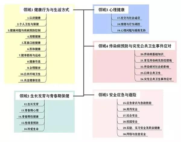 《指南》主要内容涉及健康行为与生活方式、生长发育与青春期保健、心理健康、传染病预防与突发公共卫生事件应对、安全应急与避险等5个领域30个核心要点。