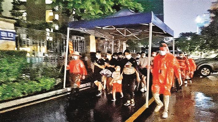 在暴雨来袭的夜幕下,身披橙色雨衣的工作人员早已全身湿透,但仍然撑起“移动帐篷”来回移动,有条不紊地分批护送在场居民往返入口和核酸检测现场。在暴风雨中,用“移动帐篷”为居民撑起“温暖怀抱”,是大浪街道龙平社区以党建引领,全力打造平安社区、暖心家园的一个生动实践。