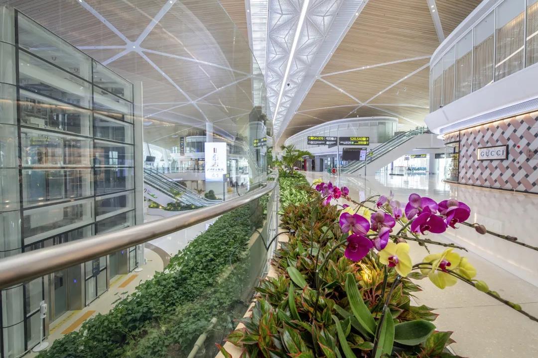 清新宜人的卫星厅拥有500平米的绿植墙,300平米的景观户外花园,86廷米空中绿化和两侧50平米梯级绿化,植物种类达到50种,是名副其实的空港植物园。