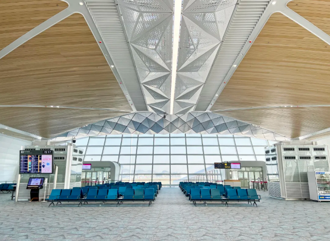 卫星厅以独特、创新的设计让旅客透过全景玻璃幕墙即可“见山、望海”,营造湾区创新、前沿的特色门户印象,呈现国际化一流空港门户气质。