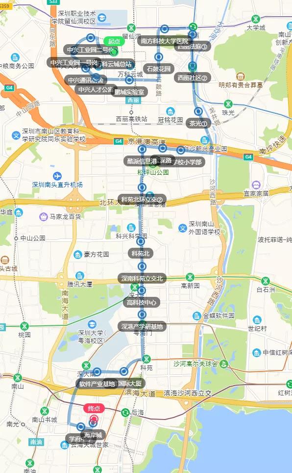 增加站点:双方向增加“高科技中心、深港产学研基地、百度国际大厦、软件产业基地、学府中学、海岸城”等6对公交停靠站。
