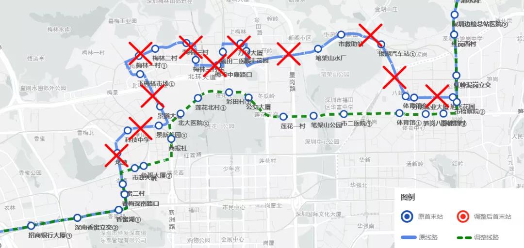 取消站点:双方向取消“梅林二村、梅林三村、梅林阁、中康公园、万科大厦、中级法院、莲花二村①、园心苑②”等8对公交停靠站。