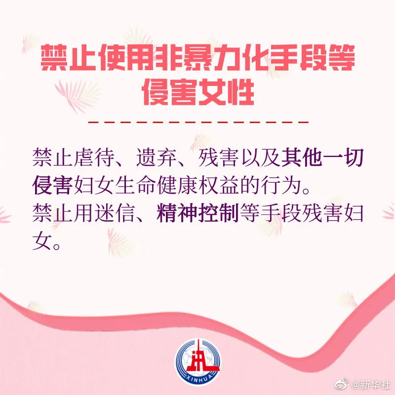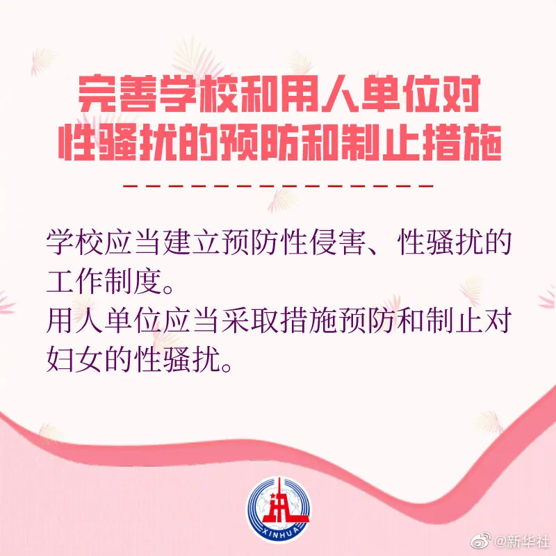 草案明确,国家采取必要措施,逐步完善保障妇女权益的各项制度,消除对妇女一切形式的歧视,禁止基于性别排斥、限制妇女依法享有和行使各项权益。草案针对教育就业领域的性别歧视作出规定,完善性骚扰的预防和制止措施,对离婚时家务劳动经济补偿增加规定……