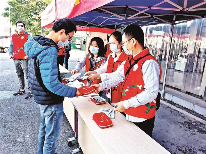 库坑社区红色网格摆摊设点,向居民派发创文知识手册、防疫健康包。