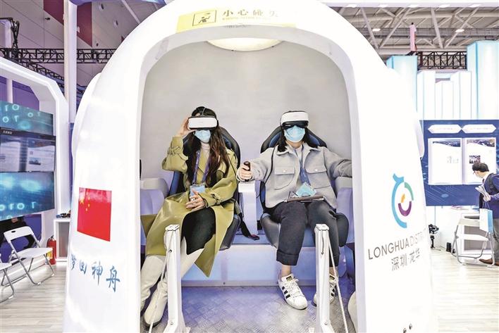 展馆内部以龙华区十大产业进行布局规划,展示龙华区工业互联网、区块链、人工智能、新型显示、智能制造装备、消费互联网、时尚创意、数字文化、集成电路、生命健康十大产业基础及优势。现场的展品,有可以把一切透明介质(玻璃、亚克力等)变为高清、亮丽的裸眼AR展示屏,有解决失能老人护理工作痛难点的“大小便”智能护理机器人,还有实现人体感知、跌倒报警、体征检测功能的毫米波雷达等高新科技产品,展品种类丰富,独具特色,亮点多多。值得一提的是,为营造展馆的科技氛围,增加整体的趣味性与互动性,龙华区设置了外观还原神舟飞船返回舱的“梦回神舟”VR体验仓,让观众以航天员第一视角体验,探索太空,遇险、又重返地球的过程,为观众带来沉浸式的感官享受。