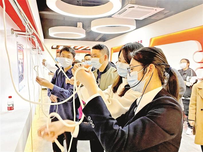企业员工在龙华区安全教育基地体验结绳逃生实操。