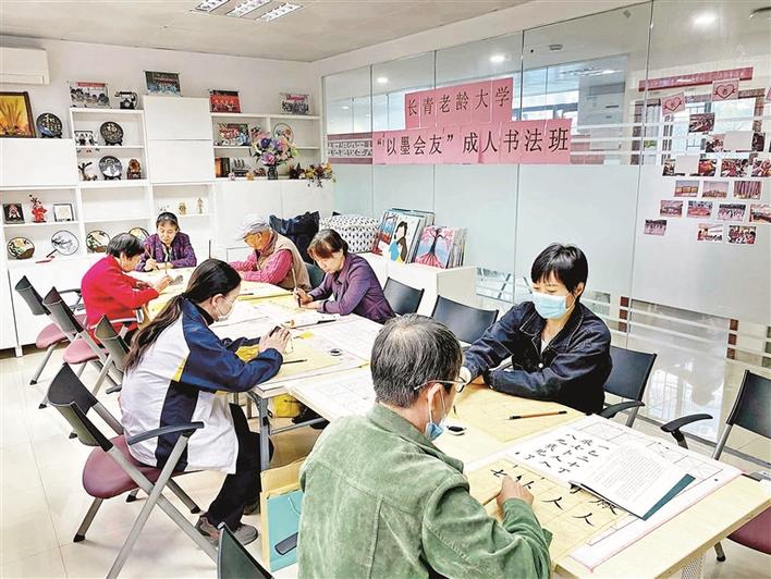 应对老龄化社会,基层社区有作为。今年以来,针对长者群体,社区牵头成立长者互助书法班、唱歌班、民族舞班、交谊舞班。不同于以往社区开班设课时的专业老师授课模式,这些课程突出“银龄互助”元素,从社区居民的兴趣出发,由有一技之长的热心长者当老师,带领邻里街坊学习进步。邓阿姨给自己报了3个学习班,每天都很“忙碌”,女儿开玩笑说,“一天到晚不见人,家里就像个宾馆,学习班都快成为住家了。”