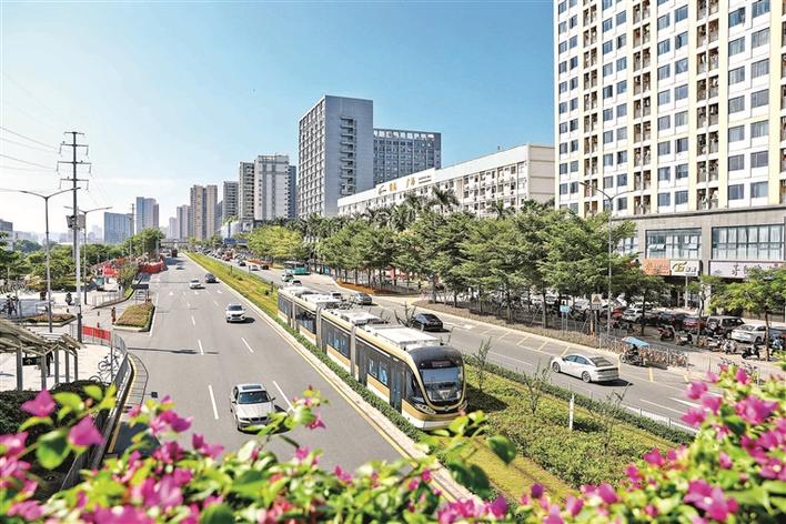 龙华现代有轨电车行驶在风景优美的龙华大道上。