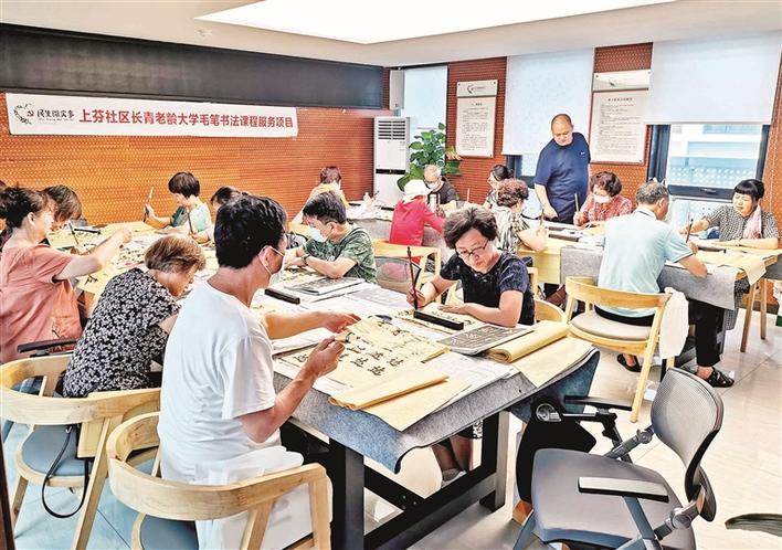 社区老年人在社区长青老龄大学学习书法。