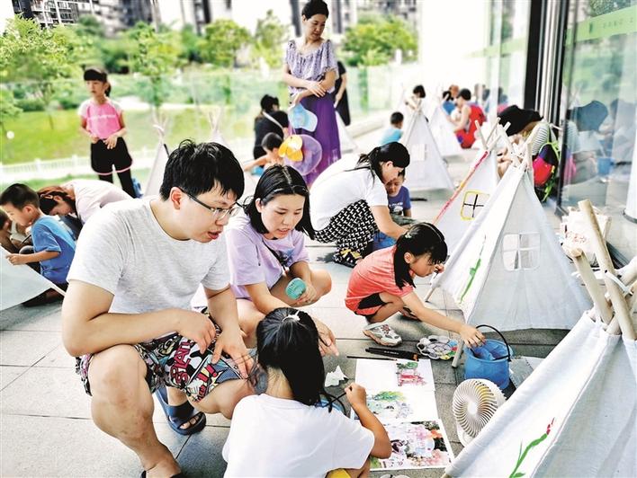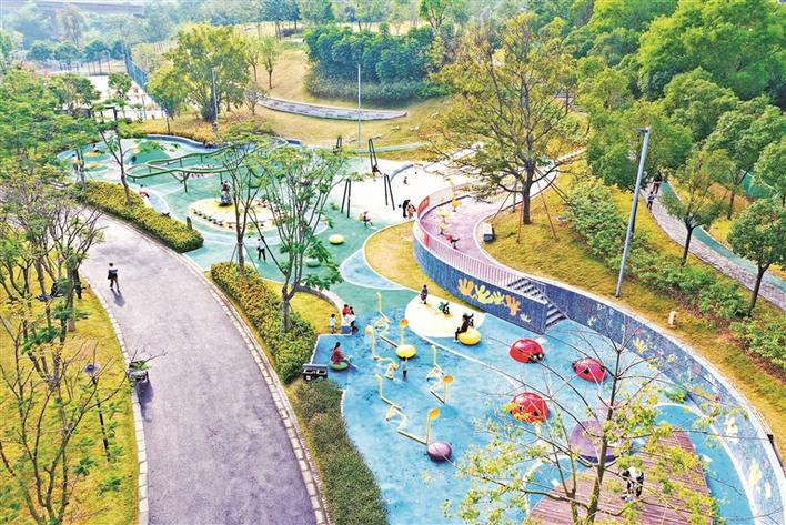 市民带着孩子在白鸽湖客家文化公园儿童娱乐区游玩。