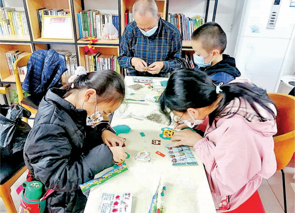 福城街道新和社区家长和孩子们一起制作福袋香包。