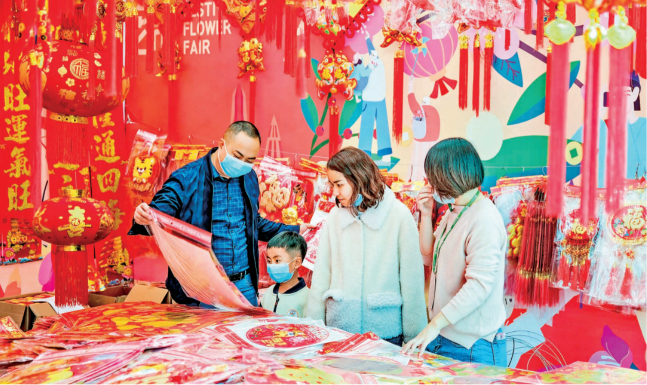 市民在观澜天虹迎春花市购花点选购对联和新春装饰品。