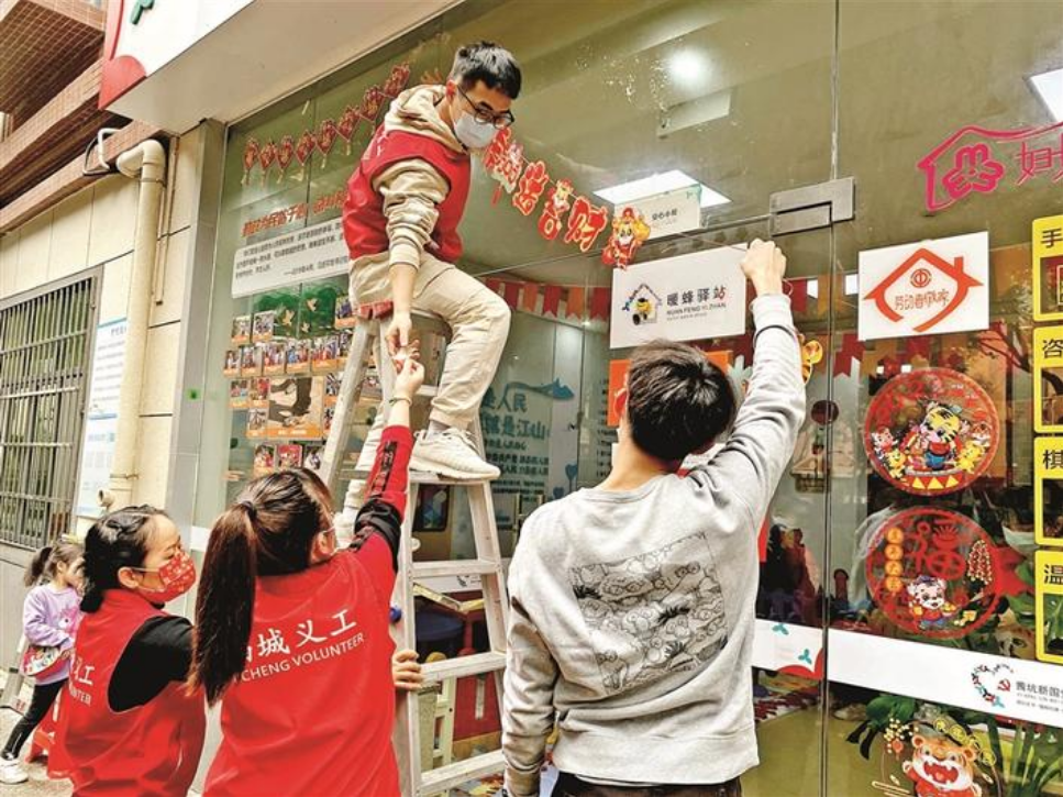 龙华新闻讯(记者 黄晓华 通讯员 刘菲 陈钧瀚/文 记者 陈建华 通讯员 朱正英/图)1月27日,福城街道招商锦绣观园党群服务中心、茜坑新围党群服务V站格外热闹,社区网约车司机、公益技能达人、志愿者等20余人来到这里,动手为社区党群阵地进行新年装扮。一番打扮下,既具“年味内涵”又有“颜值”的党群服务阵地,显得格外“养眼”,散发别样的年味。