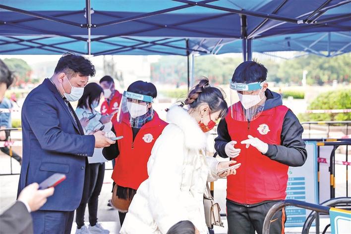 可可沙龙志愿者在龙华文化广场核酸检测点参与疫情防控工作。