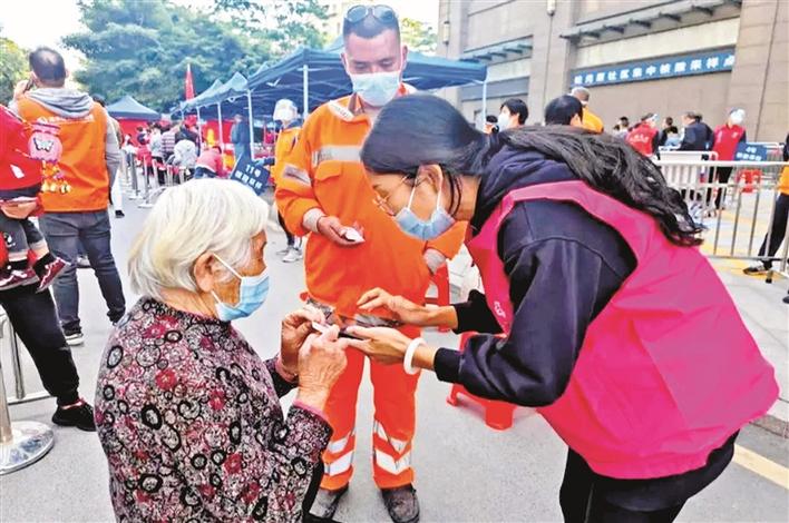 龙华区创新实验学校的教师志愿者在龙华人民路友谊书城核酸检测点参与志愿服务。
