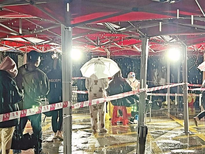 当天气温骤降至10℃,冷雨寒风相随,如何快速设置核酸检测点是一个防疫考题。面对人员紧缺的情况,樟坑社区党委发出招募令,在短短十几分钟就有10多名党员积极响应,火速前往樟坑一区文化广场核酸采样点。