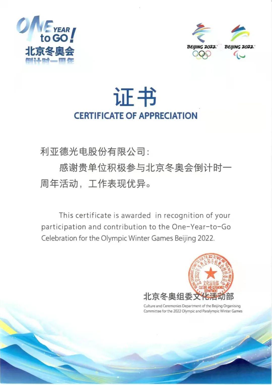 冬奥倒计时一周年证书