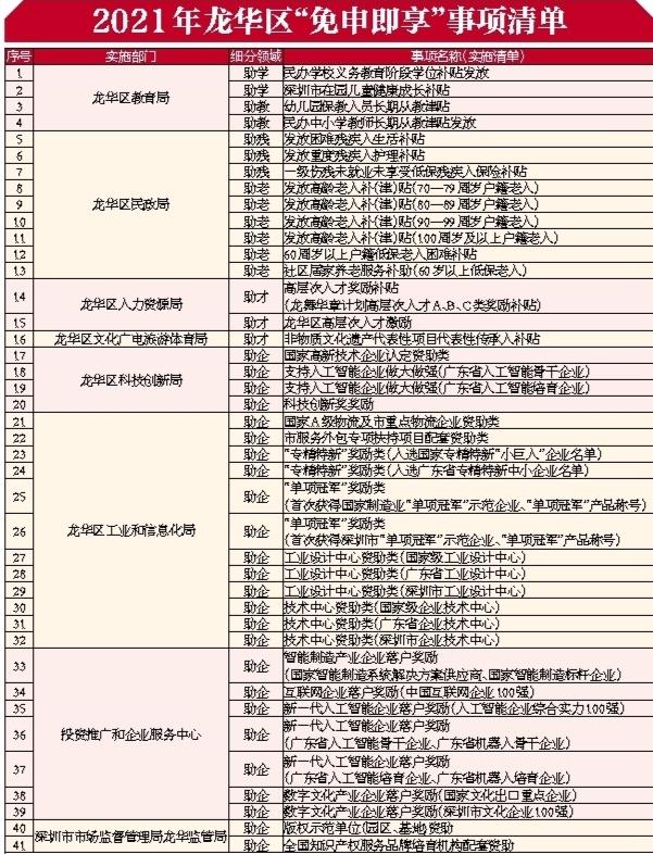 今年以来,龙华区从“服务侧”改革,推行了41项“免申即享”惠企惠民政策,编制“免申即享”惠企政策办事指南,规范并明确政策兑现的条件、时限、流程等,使企业和群众充分了解政策规定、操作流程,实现由企业‘上门找政策’变为政府‘上门送政策’,精准供给“免申即享”惠企惠民政策服务,强化政策的到达率和兑现率。