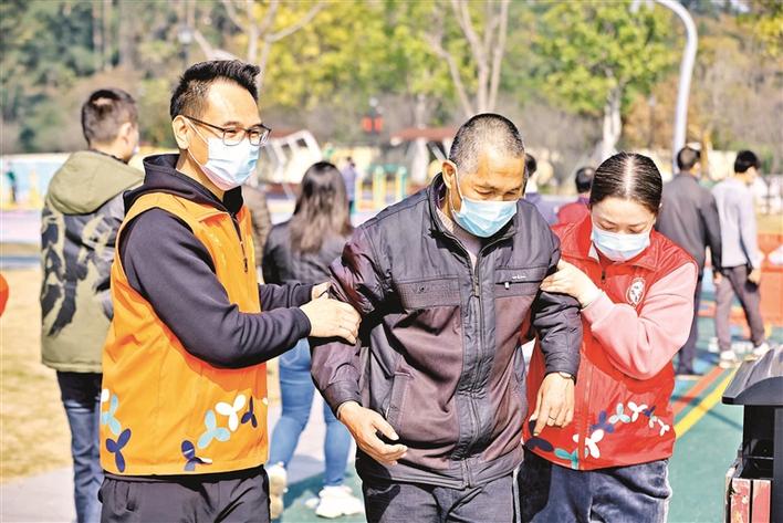 龙华区各级党组织和广大党员干部积极响应号召坚守一线。图为观澜街道大水田社区党员志愿者搀扶行动不便的市民进行核酸采样。