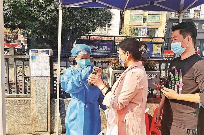 冯丹(左一)在社区一线参与疫情防控。图片由民治街道提供