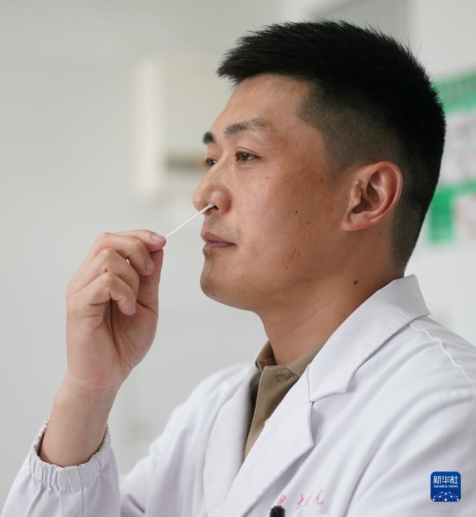 3月15日,在东南大学附属中大医院,张臣进行鼻拭子采样。新华社记者 季春鹏 摄