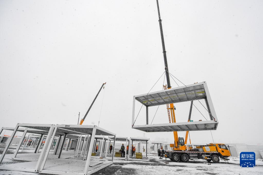 3月15日,工人在吉林市高新南区隔离方舱项目施工现场吊装隔离方舱箱体。