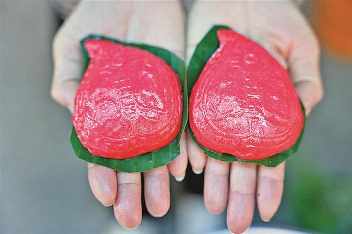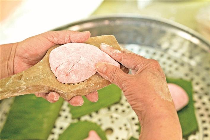“只有村里的老人过60岁大寿时才会做寿桃,平时做茶果居多。”糯米粉加上食用红米粉后,搓揉成团,制作者揪下一小块面团捏圆再展开,往面团里倒上两大勺用糖炒熟炒香的花生碎,然后捏出个立体的模样,用模具压制,成型后取出,寿桃就做好了。制作寿桃的模具“年岁”也不小了,自好姐嫁入社区后,它便一直充当着好姐制作美食的“好帮手”。模具上雕刻的花纹中可清晰看到多处“石榴仔”纹路,寓意着吃到寿桃的老人子孙多福,“现在市面上已经买不到雕刻这种花纹的模具了。”好姐笑称。制作好的寿桃,只需隔水蒸上10分钟左右即可出锅,出锅后还要给每个寿桃抹上一些食用油,助其更好定型。