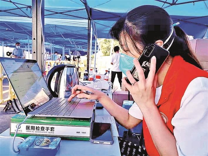 茜坑社区工作人员庄万行负责便民服务热线之余,还负责流动核酸检测采样点的引导工作,担心工作会有遗漏,庄万行把每一个电话随手记下来,写清诉求、解决方式、居民信息等,并及时做好反馈,经常往地上一坐,台阶就是桌子,来不及坐下就站着,随身两个电话换着听。居民的每一个电话,他都认真对待。