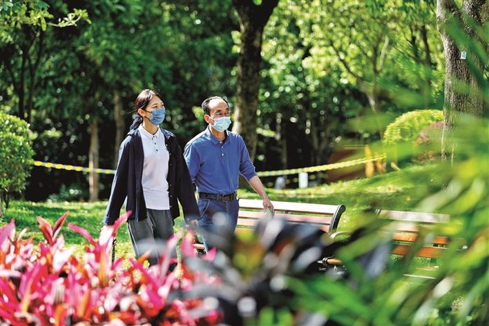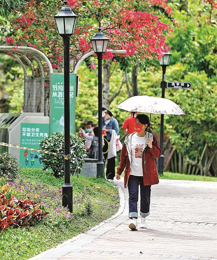 在绿道穿行,沿途可赏南洋楹、麻楝、樱花木棉、波斯菊花海、杜鹃花坡等鲜花绿植营造的迷人风光,听小溪流水潺潺之声。在翠竹环绕的“竹径通幽”探寻风吹过的痕迹,在“蝴蝶谷”看百花“邀约”下蝴蝶翩翩起舞,在架空栈道上想象巨龙盘卧山间的慵懒,在“山水连城”观赏界面看山与城的交融,在“玉林湾”处看波光粼粼的水面上泛起金黄,在“七仙泉”融入亭、树、溪水的意境中吟诵“小桥流水人家”……