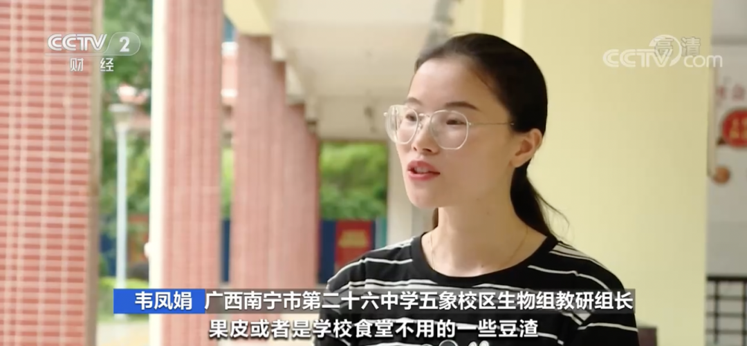 广西南宁市第二十六中学五象校区生物组教研组长韦凤娟:果皮,或者是学校食堂不用的一些豆渣,沤制成有机肥。