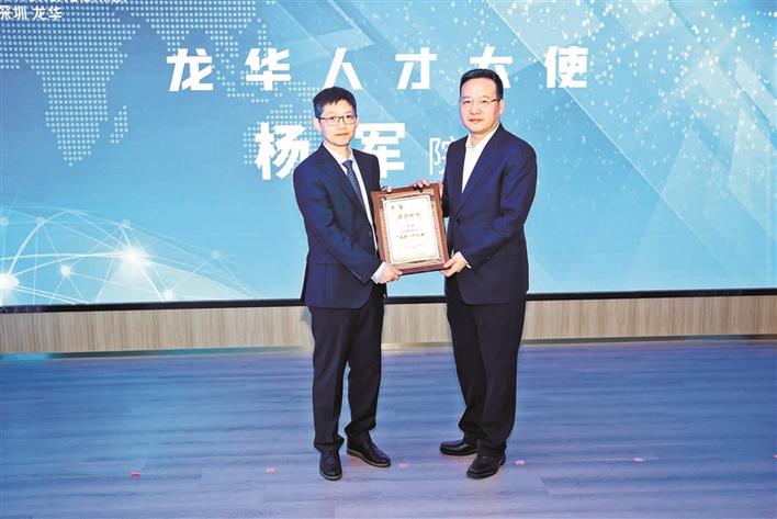 区委书记王卫(右)为杨军院士颁发“龙华人才大使”荣誉证书。