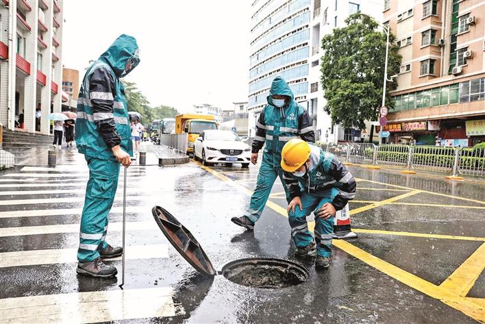 昨日上午,龙华排水公司工作人员巡查龙华中学考点周边易积水路段。