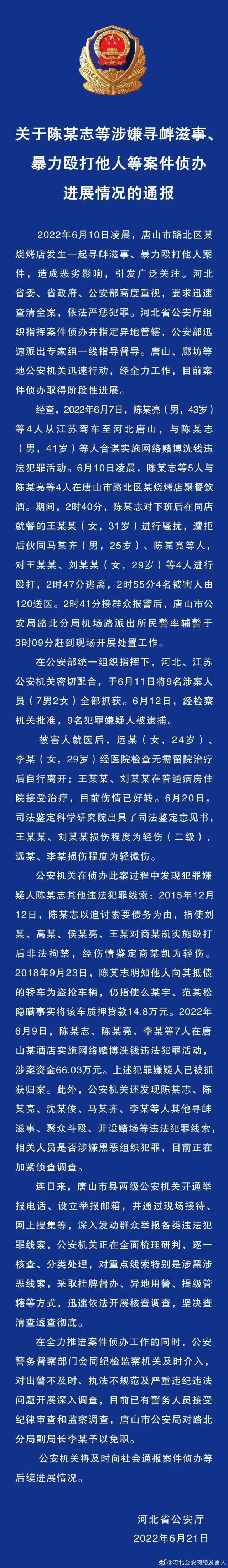 6月21日,河北省公安厅发布《关于陈某志等涉嫌寻衅滋事、暴力殴打他人等案件侦办进展情况的通报》,全文如下: