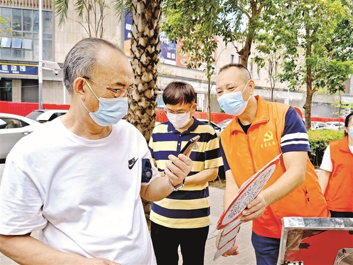福民社区党委书记张国帆(右一)引导居民扫核酸码。