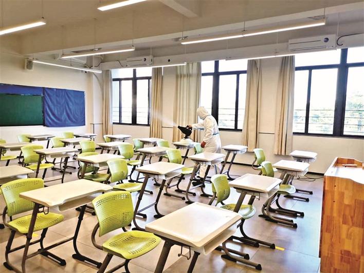 工作人员对考场进行消毒。
