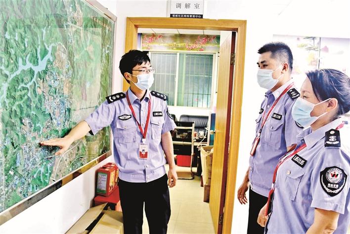 区网格员黄志颖(中)将大学学习的信息技术知识快速运用到网格管理工作实践中,成为一名“全功能”、“数字化”的网格员。
