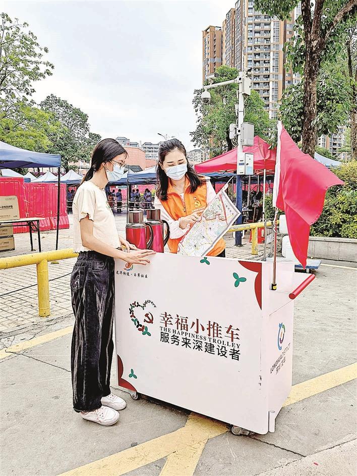 龙华街道党员志愿者依托“幸福小推车”为来深建设者服务。