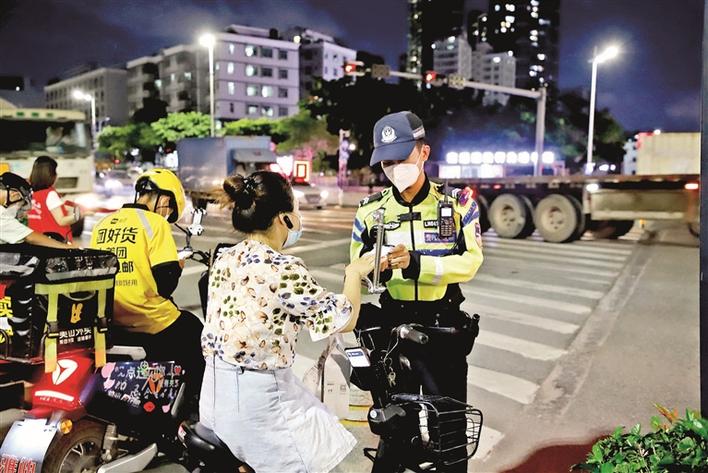 交警在福城街道辖区主要路段对交通违法骑行人员及市民进行劝导。