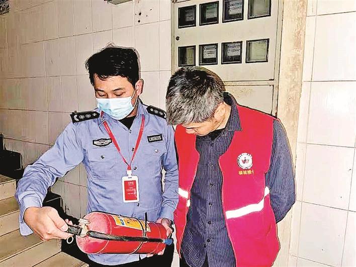 兴富社区网格员及楼栋长排查灭火器是否有过期。