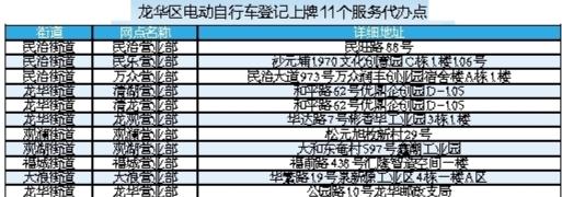 由于电动自行车涉及面广、保有量大,为了有序开展好此项工作,同时遵守防疫不聚集的要求,现阶段采取“先网上预约、再到场登记”的方式开展,即“网上预录入资料-预约服务代办点-到场交验车辆”。记者获悉,电动自行车登记的现场验车和选号等工作依托市邮政服务网点实施代办。全市第一批共设置95个服务代办点,其中龙华区设置11个服务代办点,服务时间为每天9时至18时,为方便市民,各网点周末及节假日照常办理登记。此外,龙华区还设置了2个牌证自取点。