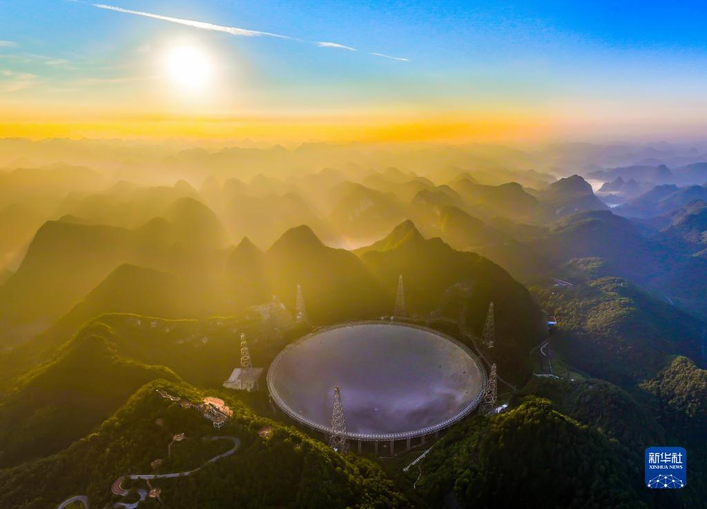 晨曦中的“中国天眼”全景(无人机照片,2022年7月25日维护保养期间拍摄)。