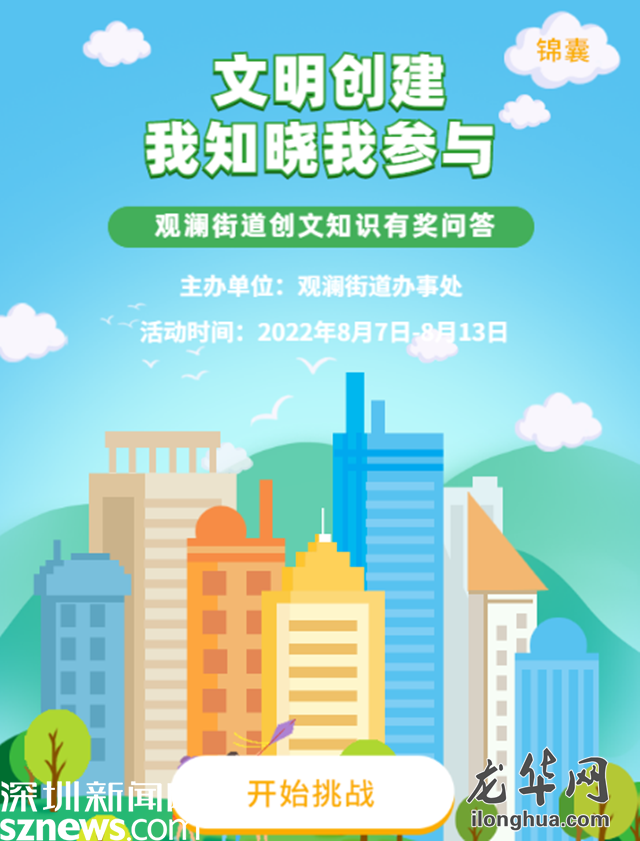 在线上,观澜街道开展了为期7天的“文明创建我知晓我参与”创文知识线上有奖问答活动,活动设置了文明出行、文明用语等创文知识题目,让参与者在答题过程中潜移默化地提升文明创建知晓率和文明意识。自创文知识线上有奖问答活动开展以来,截至目前已有上万名群众踊跃参加。另外,观澜街道还推出“每日创文知识我知道”宣传活动,通过制作H5宣传海报,每天发布一个创文小知识,在朋友圈、塔式微信群等广泛转发,特别是文明养宠、垃圾分类等文明创建小知识受到广大居民朋友点赞,共计吸引超过3000人次转发,辐射人群超10万余人。
