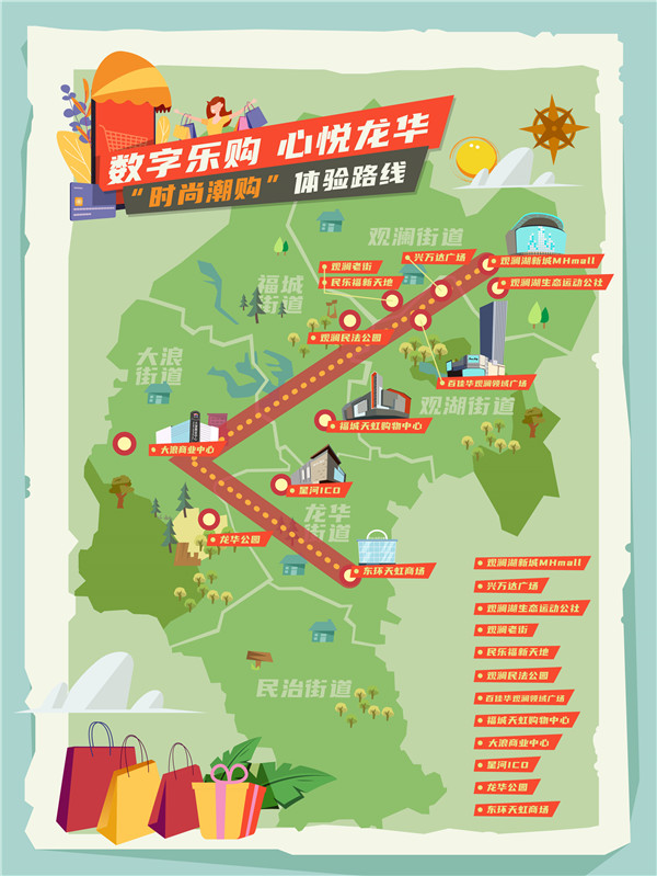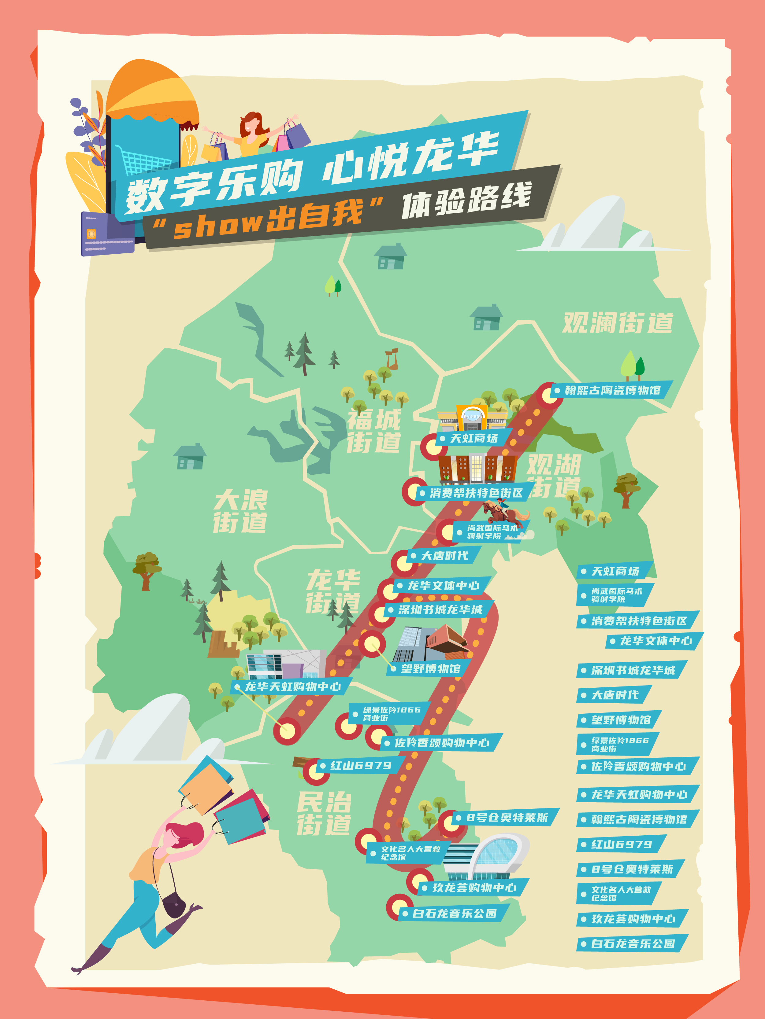 今年龙华区购物节特别打造“爱龙华”三条消费体验路线,串联辖区大型商超、汽车4S店活动、文旅、公园、消费帮扶街区等内容,打造龙华区购物节消费体验地图。地图涵盖沿线参与购物节活动的商户的位置、所有商户活动的汇总信息、商家的优惠券领取、特定主题活动预告等,为广大消费者提供便利,让大家开心消费,打卡龙华。