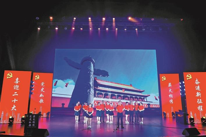 现场选取《映山红》《弹起我心爱的土琵琶》《没有共产党就没有新中国》《走进新时代》《我和我的祖国》《歌唱祖国》等9首镌刻着时代印记的歌曲,先是由“联帮带”各成员团党员以丰富的形式进行传唱,再由主讲人从音乐蕴含的时代内涵,到歌曲背后的党史故事,带领现场党员穿越时光、领略壮阔风景。