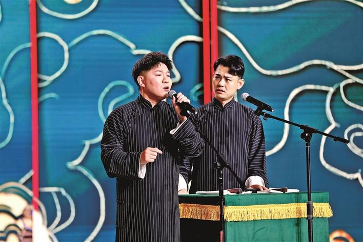 卢鑫、玉浩(右)表演相声《中国歌曲漫谈》。