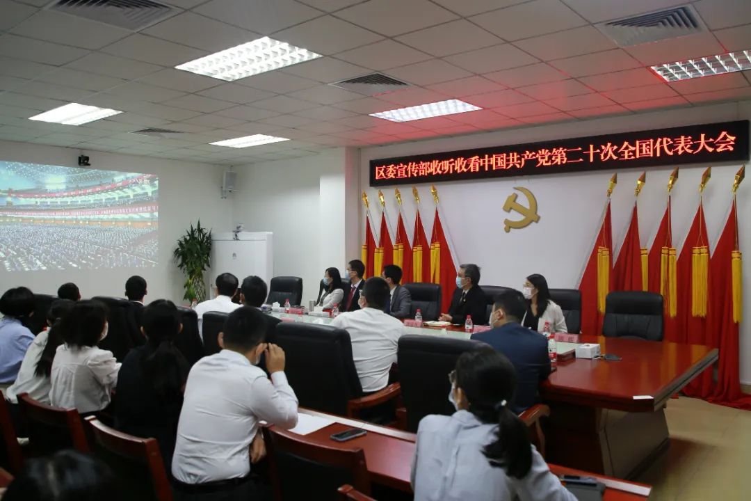 在集中收听收看过程中,区委宣传部全体干部职工聚精会神聆听习近平总书记代表第十九届中央委员会向大会作的报告。收看结束后,区委宣传部结合工作实际迅速召开学习研讨会。大家纷纷表示,要认真学习领会报告精神,更加紧密地团结在以习近平同志为核心的党中央周围,高举中国特色社会主义伟大旗帜,全面贯彻习近平新时代中国特色社会主义思想,弘扬伟大建党精神,深刻领悟“两个确立”的决定性意义,增强“四个意识”、坚定“四个自信”、做到“两个维护”,自信自强、守正创新,踔厉奋发、勇毅前行,自觉承担好举旗帜、聚民心、育新人、兴文化、展形象的使命任务,迅速掀起学习宣传贯彻党的二十大精神热潮,让党的二十大精神家喻户晓、深入人心,汇聚起奋进新征程、建功新时代的强大力量。