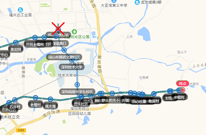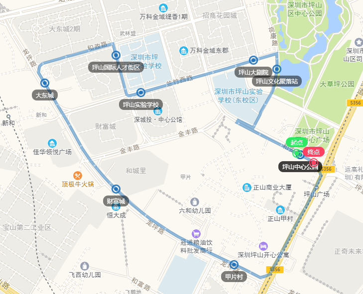 坪山中心公园(可接驳坪山广场地铁站)、甲片村、财富城、大东城、坪山国际人才街区、坪山实验学校、坪山大剧院、坪山文化聚落站、坪山中心公园(可接驳坪山广场地铁站)