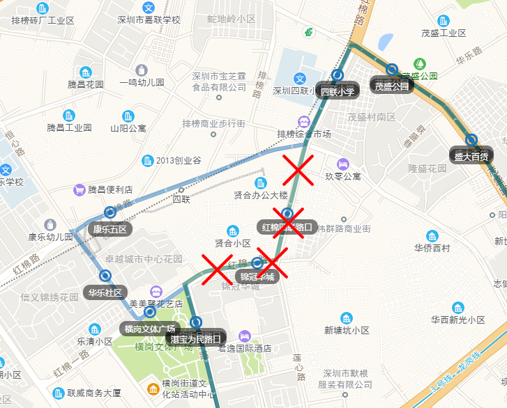 双方向增加“康乐五区、华乐社区、横岗文体广场”等3对公交停靠站,取消“红棉四联路口、锦冠华城”等2对公交停靠站。