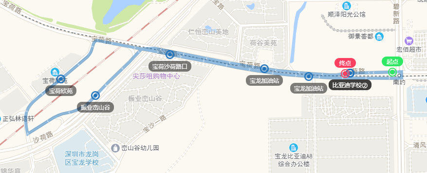 比亚迪学校②(可接驳南约地铁站)、宝龙加油站、振业峦山谷、正弘林语轩、振业天峦、振业峦山谷、宝荷沙荷路口、比亚迪学校、比亚迪学校②(可接驳南约地铁站)